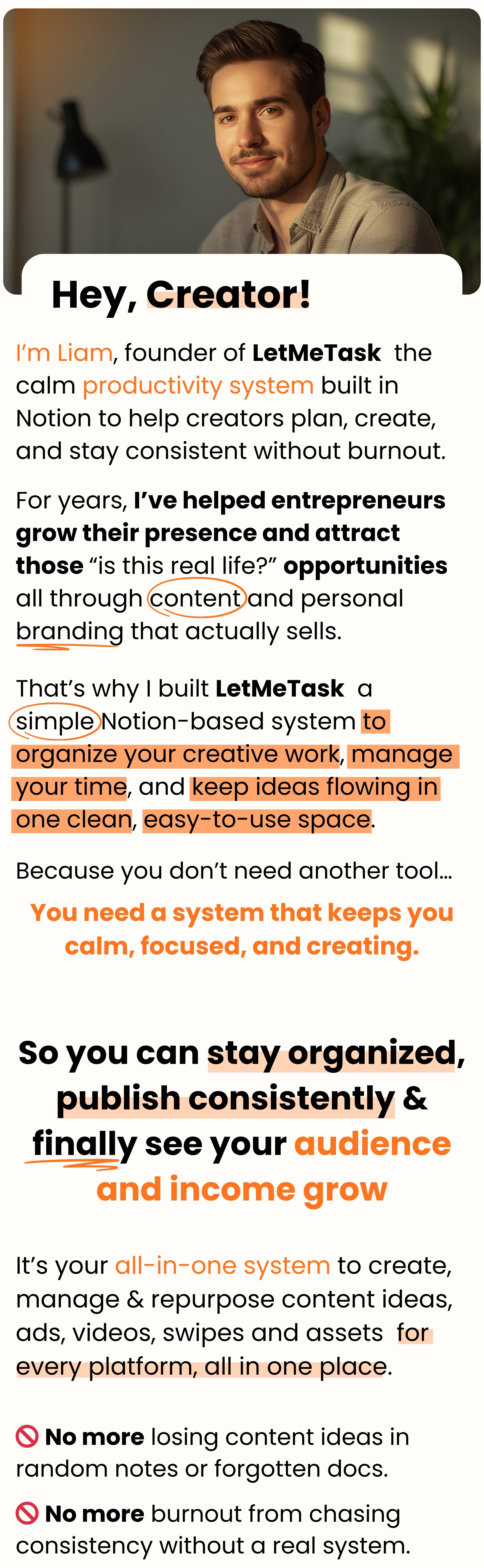 I’m Liam, founder of LetMeTask — the calm productivity system built in Notion to help creators plan, create, and stay consistent without burnout.